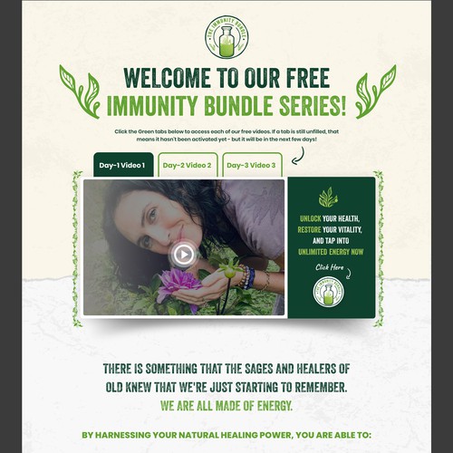 Create a page that features a 3-day video drip element in the hero along with a sales page below. The video player will